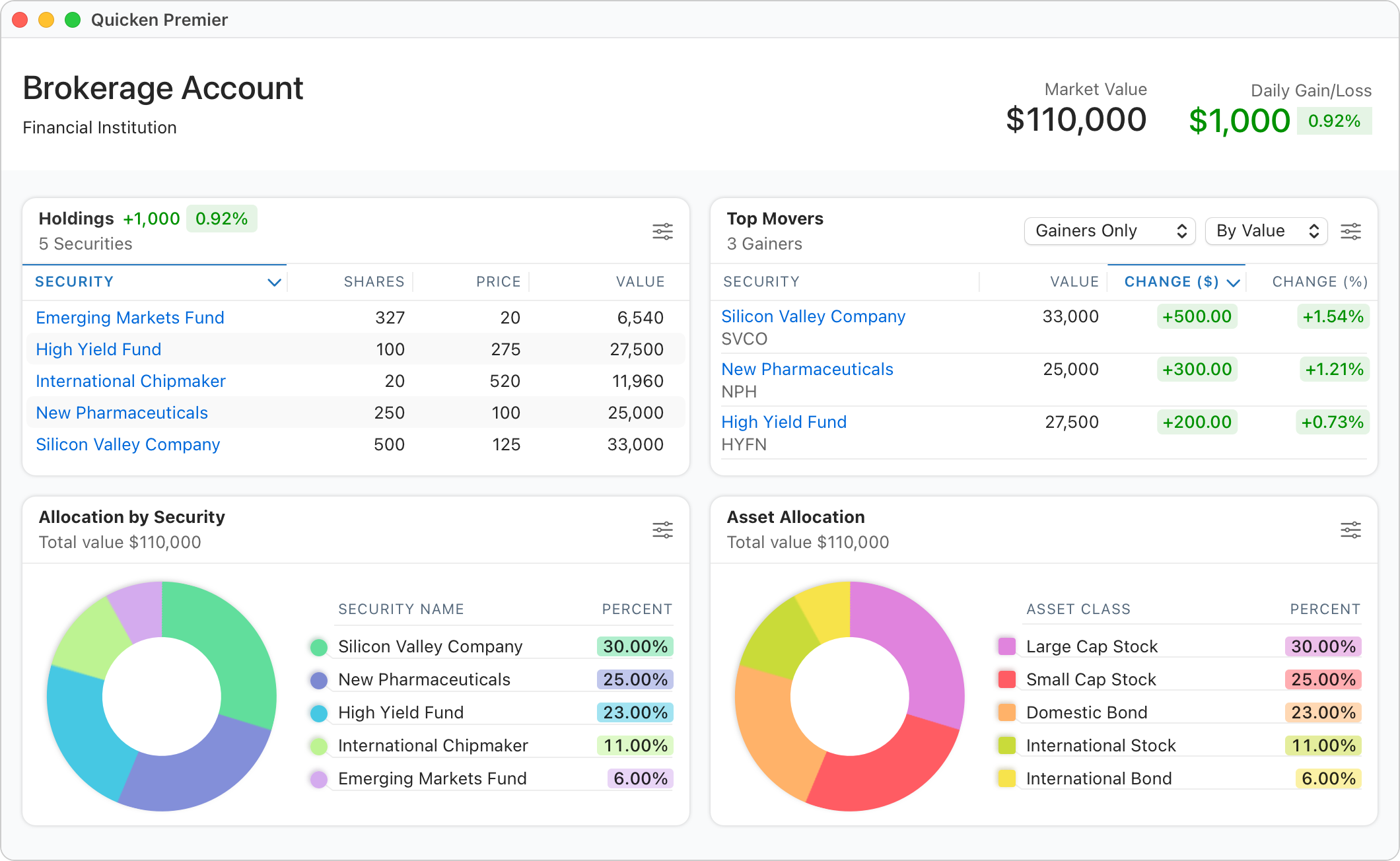 Just about anything. Quicken Deluxe and Quicken Home & Business offer the best tools on the market for managing investments and transactions. Use it to monitor all your investments: brokerage, SSRP, RESP, and even private holdings.